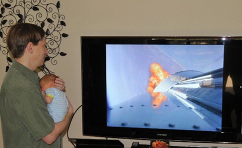 Johnathon Caldwell, vice president and general manager of Lockheed Martin Military Space, holding his newborn son as he watches the launch of SBIRS GEO-1 in 2011.